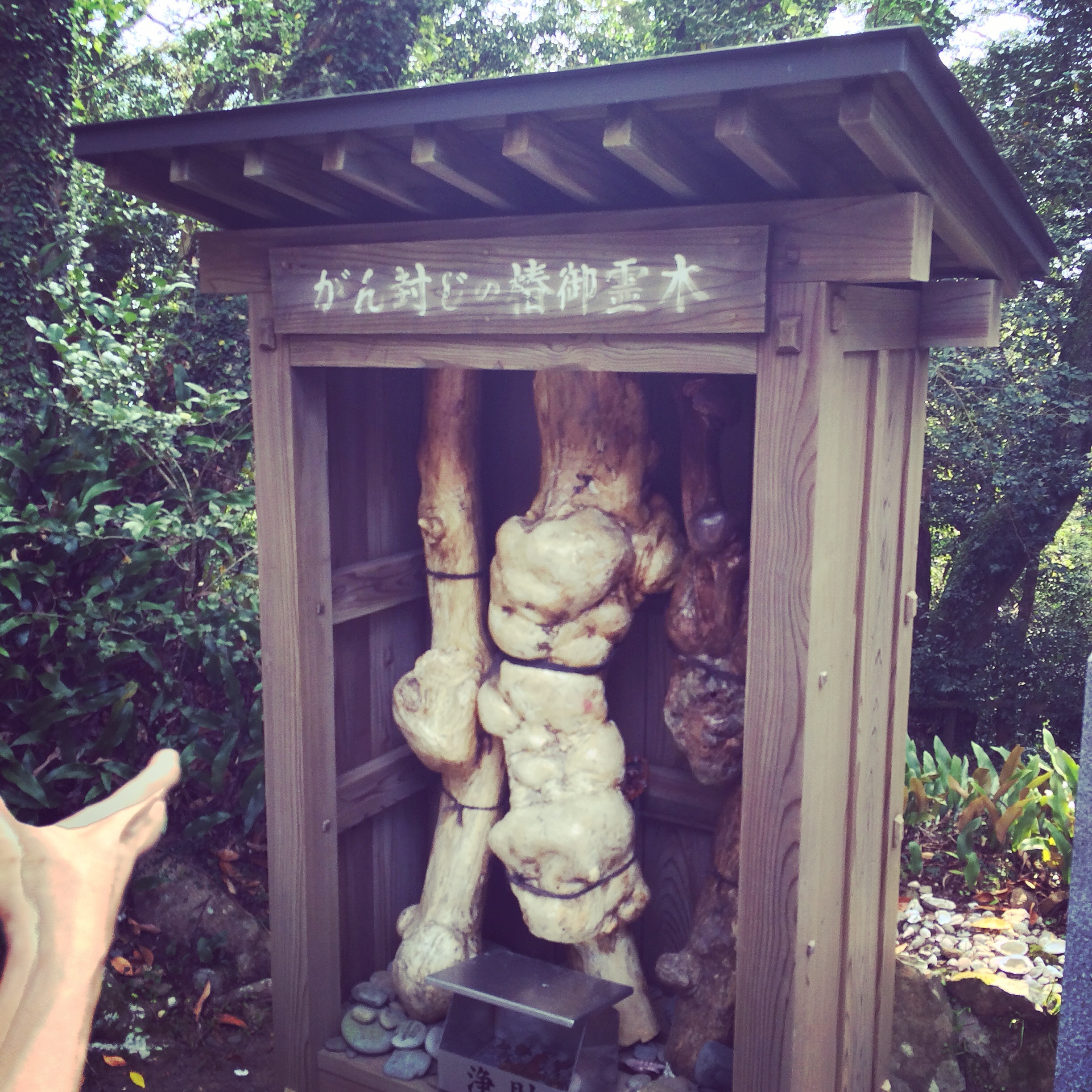 枯れてしまって幹の部分が展示されていました。お遍路さんがその幹を触って、毒を吸い取ったようにコブができていました。